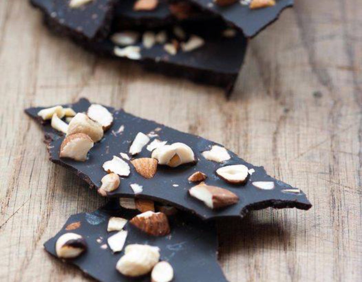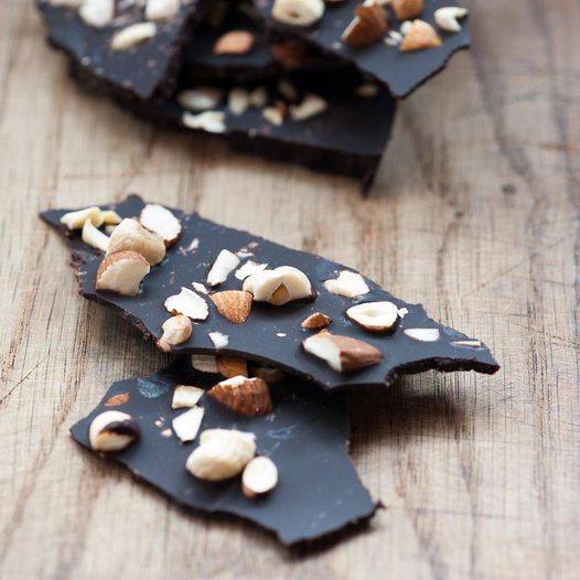 Cuando esté templado; agregar frutos secos picados (idealmente activados y deshidratados)+ pizcas de sal marina opcionalmente .Llevar a heladera (o freezer si es chocolate casero) hasta que solidifique. Conservar en heladera hasta el momento de consumo .