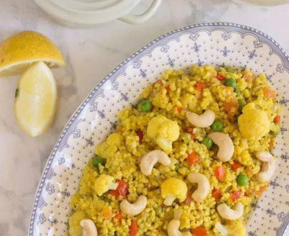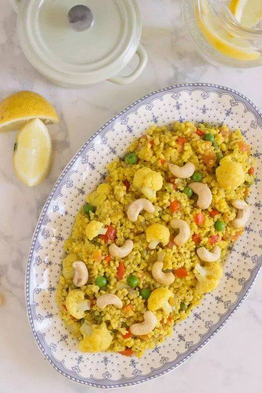 Cuando la cebolla esté transparente añade sal al gusto, la canela, la pimienta, el perejil, la cúrcuma, el ajo en polvo, las verduras (guisantes, coliflor y tomates), el mijo y el caldo de verduras. Deja a fuego alto hasta que empiece a hervir. Luego tapa la cazuela y baja el fuego al mínimo.