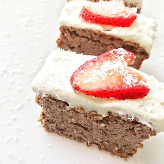 Cocinar en horno precalentado a 180 grados por 30 minutos (varia según horno). 🔸Enfriar y topicar con queso crema descremado o yogurt de coco sin azúcar endulzado (con stevia y extracto de vainilla