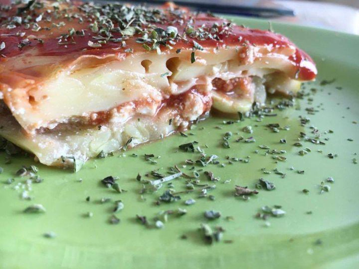 Tapizar el fondo de una asadera rectangular con una capa de zucchinis, luego la preparación con ricotta y luego la mitad de la salsa de tomate