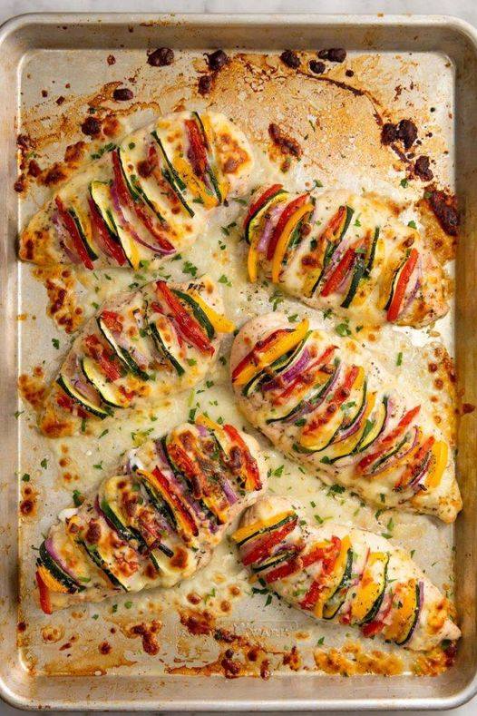Precalienta el horno a 400 °. Haz cortes en cada pechuga de pollo, teniendo cuidado de no cortar completamente, y rellena con calabacín, tomates, pimientos y cebolla morada.
