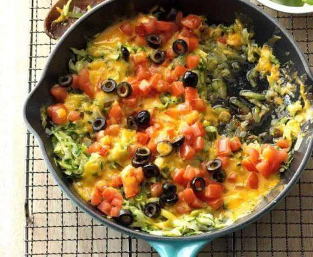 Agrega en un sartén la mantequilla y cebolla hasta que esté tierna, pero ala vez crujiente. Después incorpora el calabacín, la sal, el ajo y la albahaca, deja cocinar mientras revuelve de 4 a 5 minutos. Pasado el tiempo, espolvorea queso, tomate y aceitunas. Tapa y cocina hasta que el queso de derrita.