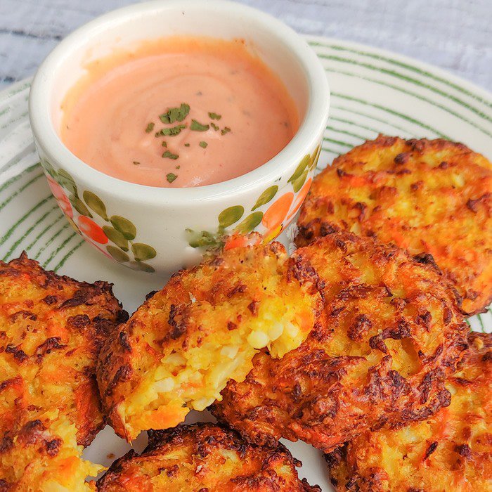 Las puedes dorar en un sartén a fuego bajo con un chorrito de aceite de oliva de 4 a 6 minutos de cada lado. O las puedes hacer en freidora de aire precalentada a 180 °C por 25 a 30 minutos o hasta que se vean doradas y firmes.