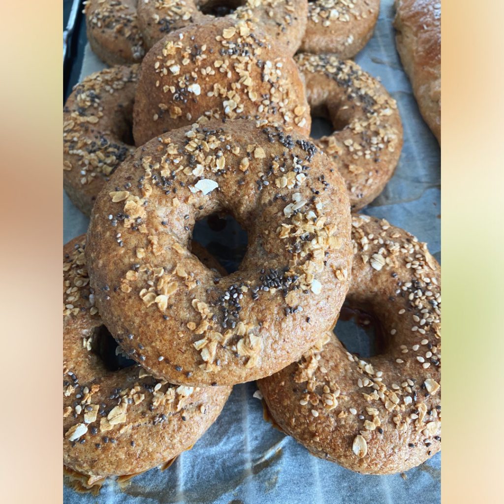 Amasar levemente y dividir en bollos iguales. Con ayuda de un dedo hacer presión en el centro para conseguir el agujero y mover el dedo en forma circular para lograr que se agrande sin romperlo.