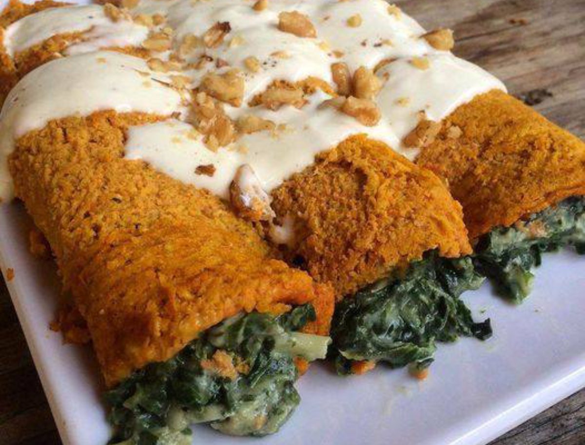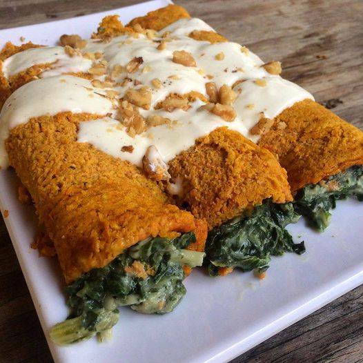 Rellenar la masa de zanahoria, enrollar y colocar por encima queso untable light condimentado con nuez moscada y unos trocitos de nueces.