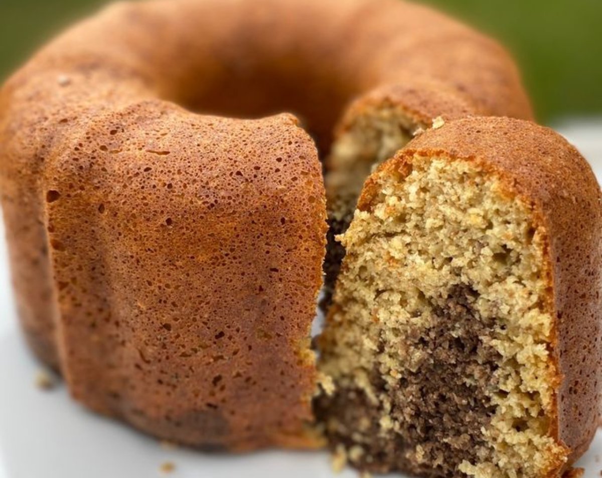 2Luego pasamos a un bowl y le agregamos las harinas tamizadas, y el polvo de hornear. Dividimos la mezcla y a una parte le agregamos cacao amargo.