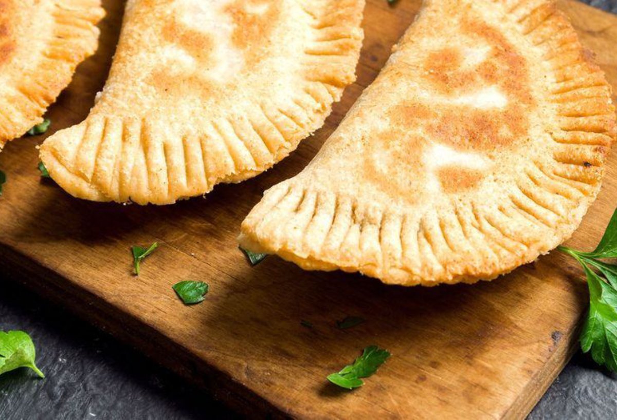 Luego rellena con el guiso, mermelada o fruta de tu elección y dobla la bolsa con la masa para darle forma de media luna. Con tus dedos une todo el borde y saca la masa restante.