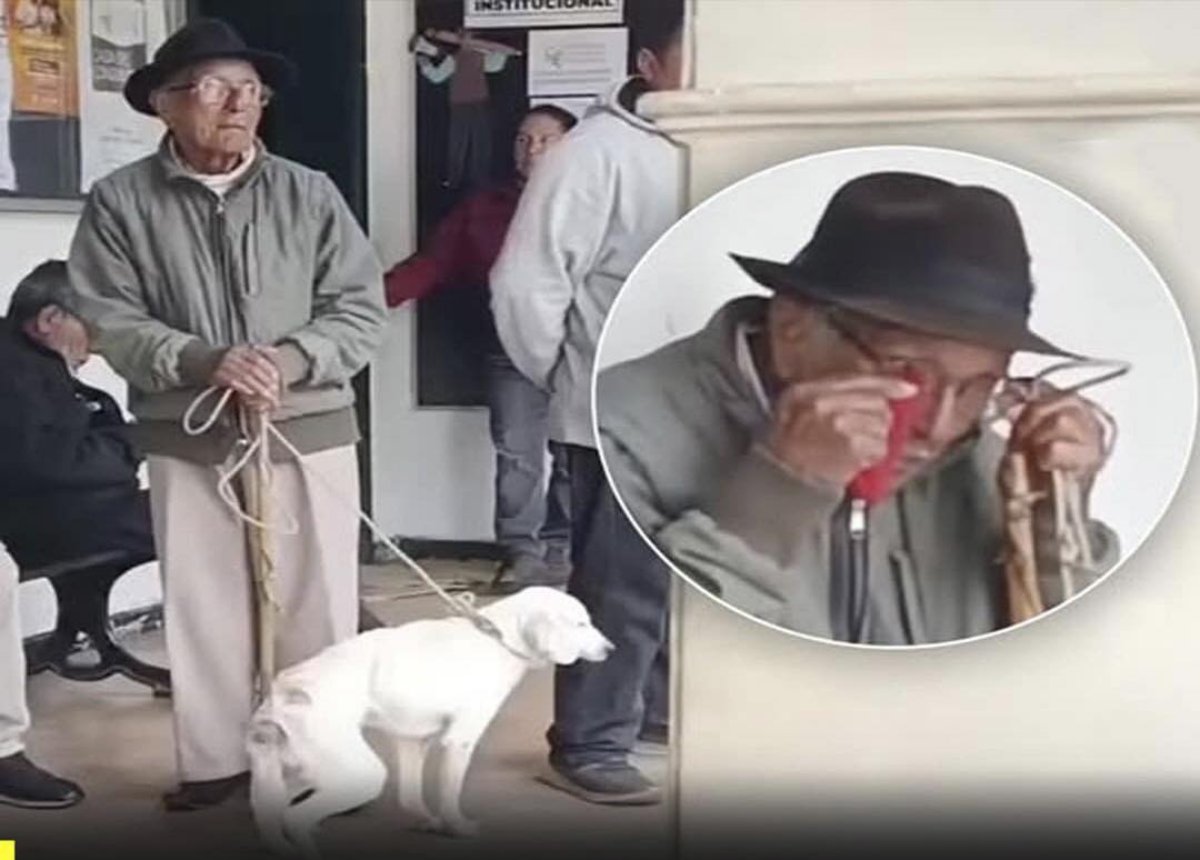 El hombre no habla. No gesticula. No parece apurado. Está ahí, firme pero cansado, como quien ha aprendido que algunas esperas no se pueden evitar. Su bastón no es solo un apoyo físico; es también un símbolo del paso del tiempo, de los años vividos, de las batallas cotidianas que ya no se libran con la misma fuerza de antes. Y a su lado, el perrito. Un perro blanco, de esos que parecen de algodón cuando son jóvenes, pero que ahora se ve débil, con la mirada apagada, respirando con esfuerzo.