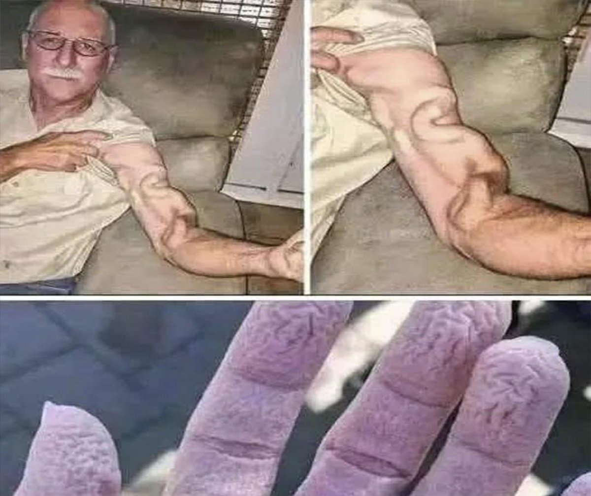 Una de las más recientes que ha circulado muestra a un hombre con un brazo sorprendentemente marcado, con venas tan pronunciadas que parecen esculpidas. En la parte inferior de la misma composición, aparecen unos dedos arrugados, como si hubieran pasado horas en el agua. Esta combinación ha generado todo tipo de reacciones: desde asombro hasta carcajadas, pero también ha levantado dudas sobre qué hay realmente detrás de esa apariencia tan peculiar.